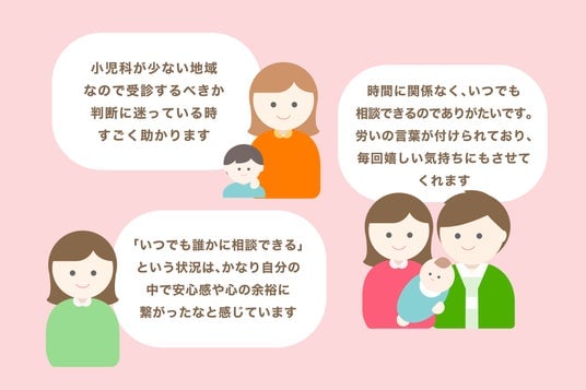 - 子供のことは些細なことでも不安になってしまうので、家にいて気軽に相談できるこのようなサービスがあってとても心強いです。
