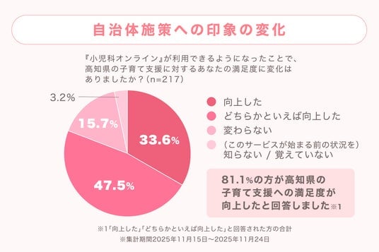 また、回答者の81.1%が「『小児科オンライン』が利用できるようになったことで、高知県の子育て支援に対する満足度が向上した」と回答しました。さらに、本サービスは利用者に対し、『疑問や不安の軽減・解消(85.9%)』という課題解決だけでなく、『いつでも相談できる安心感(73.9%)』という心理的ケアの両面で貢献していることがわかりました。
