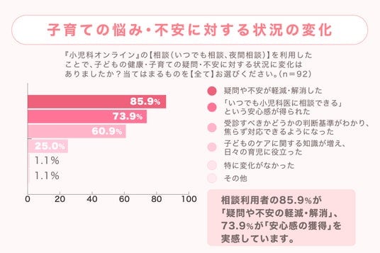 - 相談利用者のうち、「疑問や不安が軽減・解消した」方が85.9%に上ったほか、73.9%が「いつでも小児科医に相談できるという安心感が得られた」と回答しています。