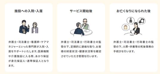具体的には、身元保証、病院・施設の入居のサポート、具体的には、ご家族の代わりに入院・入居時に保証人になったりするだけでなく、ご家族の代わりに定期的に連絡をとり、健康状況等の確認、