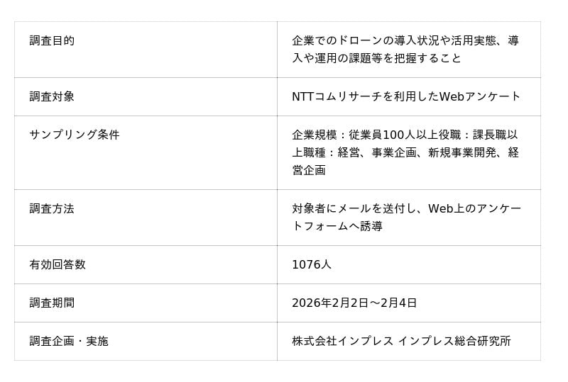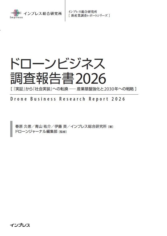インプレスグループでIT関連メディア事業を展開する株式会社インプレス(本社:東京都千代田区、代表取締役社長:高橋隆志)は、国内のドローンビジネス市場の動向を調査し、ドローンビジネスに関する調査結果を発表いたします。なお、本調査結果をまとめた新産業調査レポート『ドローンビジネス調査報告書2026[『実証』から『社会実装』への転換 ── 産業基盤強化と2030年への戦略]』(https://research.impress.co.jp/drone2026)を2026年3月27日(金)に発売いたします(予約受付中、26日(木)出荷開始)。