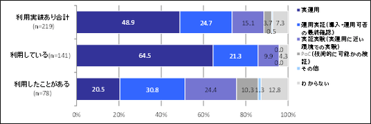 ドローンの利用実績のある企業を対象に活用の進捗を聞いたところ、「実運用」段階にあるのは約半数の48.9%でした。「運用実証」の24.7%を含めると、7割以上がPoC(概念実証)を終えて実装フェーズに入っています。現在もドローンを「利用している企業」では、「実運用」が64.5%となり、「運用実証」が21.3%に達します。一方、ドローンを「利用したことがある企業」(現在は利用していない)では「実運用」が20.5%にとどまるのに対し、「運用実証」と「実証実験」の合計が55.2%と高く、「実運用」に至る前に断念している状況もうかがえます。