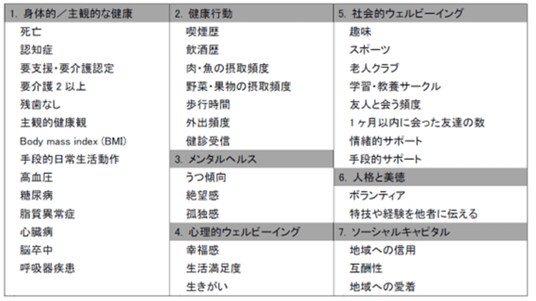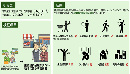 本研究では、3時点の追跡調査に回答した高齢者34,181人を対象に分析を行いました。アンケート調査では、「あなたの家から徒歩圏内(おおむね1キロ以内)に生鮮食料品(肉、魚、野菜、果物など)が手に入る商店・施設・移動販売はどのくらいありますか」という設問に、「たくさんある、ある程度ある、あまりない、まったくない、わからない」の中から回答していただきました。その結果、生鮮食料品店がたくさんあると回答した者と比較して、少ないと回答した者では、健康・ウェルビーイングに関する7領域40指標のうち、5領域8指標に負の関連が認められました。具体的には、主観的健康感、手段的日常生活動作、外出頻度が低いこと、うつ傾向や絶望感が高く、幸福感、生活満足度、地域への愛着が低いことが示されました。