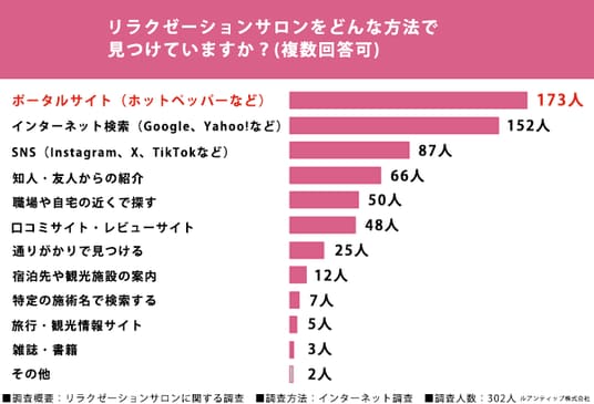 「リラクゼーションサロンを探すとき、どのような方法で見つけていますか?(複数回答可)」と質問したところ、「ポータルサイト」(173人)、「インターネット検索」(152人)、「SNS」(87人)という結果になりました。