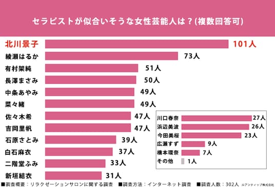 「セラピストが似合いそうな女性芸能人を教えてください。(複数回答可)」と質問したところ、第1位「北川景子さん」(101人)、第2位「綾瀬はるかさん」(73人)、第3位「有村架純さん」(51人)という結果になりました。
