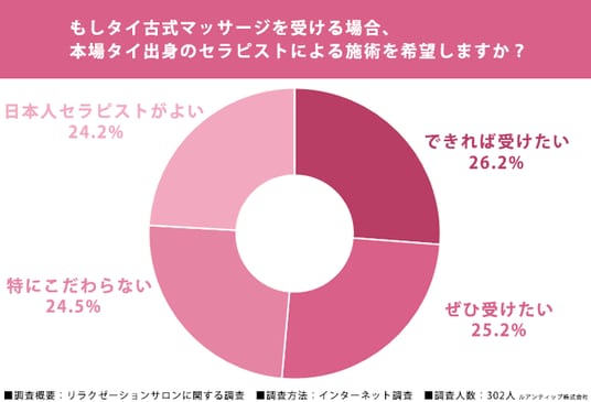 また、タイ古式マッサージを受ける場合に本場タイ出身のセラピストによる施術を希望するか尋ねたところ、「ぜひ受けたい」が25.2%、「できれば受けたい」が26.2%となり、合わせて51.4%が希望すると回答しました。