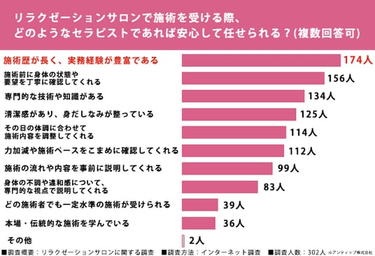 リラクゼーションサロンで安心して施術を任せられるセラピストの条件について尋ねたところ、「施術歴が長く、実務経験が豊富である」が174人と最も多く、施術者の経験値を重視する人が多いことがわかりました。