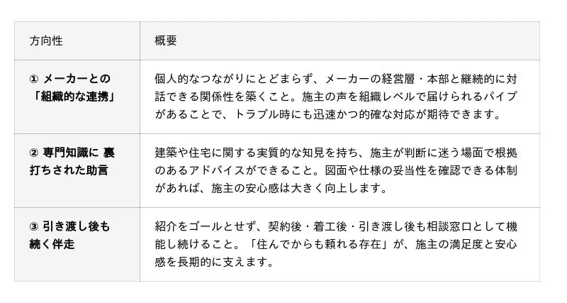 制度が広がったことで、消費者にとっての選択肢は確実に増えました。一方で、家づくりは長期にわたるプロジェクトであり、紹介がゴールではなくスタートであるという側面もあります。契約後の打ち合わせ、着工中の確認、引き渡し後のメンテナンスなど、施主が不安を感じるタイミングは紹介後にも多く存在します。こうした背景から、業界内では自然と「紹介の先にあるサポートをどう充実させるか」という問いが生まれつつあります。これはアンバサダー制度そのものの進化であり、業界全体にとってポジティブな変化だと弊社は捉えています。