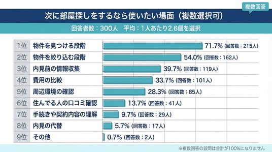 【結果7】次に部屋探しをするとしたら使いたい場面:物件を見つける段階71.7%(215人)が最多。1人あたり平均2.6個を選択