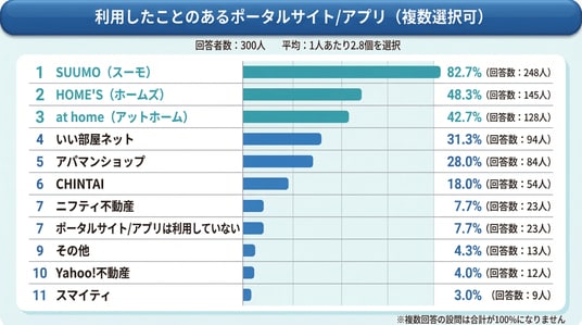 2位のHOME'Sが約半数、3位のat homeが4割超を占める点は、複数のポータルを併用して物件を探す行動が一般的であることを示しています。同じ物件でもポータルによって掲載情報が異なる、特定のポータルにしか出ていない物件がある――こうした事情が、複数併用を促しています。