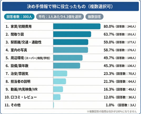 ・決め手情報で役立ったのは家賃/初期費用80.0%(240人)、間取り図63.7%(191人)