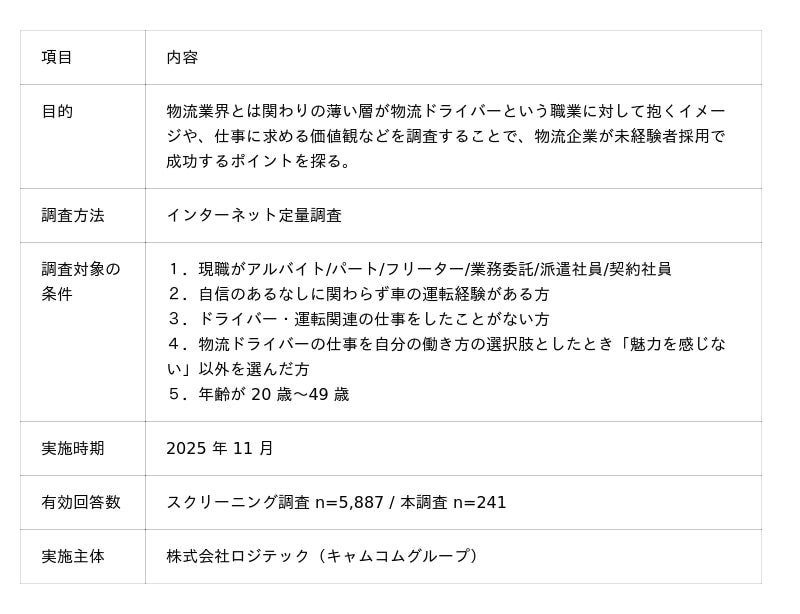 「働く」に関する社会課題をビジネスで解決するキャムコムグループの株式会社ロジテック(以下ロジテック、本社:東京都新宿区、代表取締役:縄田崇)は、物流ドライバー未経験者を対象に、職業イメージや働き方の価値観に関する調査を実施しました。その結果、具体的な労働条件を提示することで未経験者の一定層が関心を示す一方、心理的・体力的ハードルを解消する「お試し就業」への強いニーズがあることが明らかになりました。
