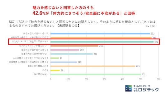 一方で、ネガティブなイメージとしては「体力的にきつそう(42.6%)」、「労働時間が⾧そう/休みが取りにくそう(41.8%)」が上位を占めました。 また、自由回答では「事故への不安」も挙げられており、これらの懸念を解消し、安全を担保する仕組み作りが不可欠です。