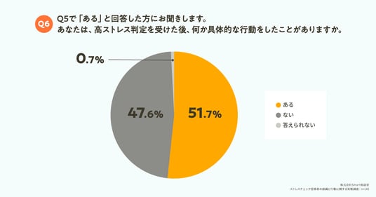 Q5で「ある」と回答した方に対して、「Q6. あなたは、高ストレス判定を受けた後、何か具体的な行動をしたことがありますか。」(n=145)と質問したところ、「ある」が51.7%、「ない」が47.6%という結果となりました。高ストレスと判定されながらも、約半数が適切なケアや対処を行っていないという実態が見えてきました。