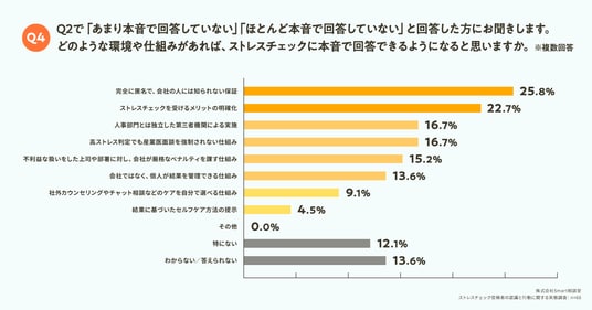 Q2で「あまり本音で回答していない」「ほとんど本音で回答していない」と回答した方に対して「Q4. どのような環境や仕組みがあれば、ストレスチェックに本音で回答できるようになると思いますか。(複数回答)」(n=66)と質問したところ、「完全に匿名で、会社の人には知られない保証」が25.8%、「ストレスチェックを受けるメリットの明確化」が22.7%という回答となりました。多くの従業員は、結果が評価や処遇に直結しないという心理的安全性の担保と、自分自身の健康維持に役立つという受検意義の共有を望んでいる実態が浮かび上がりました。