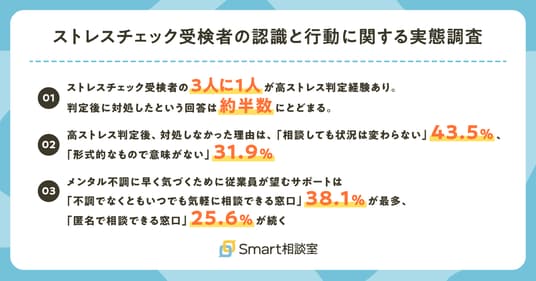株式会社Smart相談室(本社:東京都港区、代表取締役・CEO:藤田 康男)は、従業員50名以上の企業に勤務しており、直近3年以内にストレスチェックを受検した経験がある会社員430名を対象に、ストレスチェック受検者の認識と行動に関する実態調査を実施しましたので、お知らせいたします。