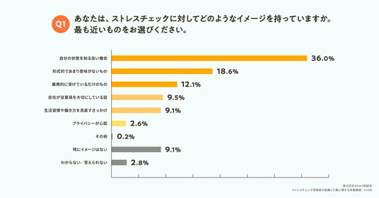 「Q1. あなたは、ストレスチェックに対してどのようなイメージを持っていますか。最も近いものをお選びください。」(n=430)と質問したところ、「自分の状態を知る良い機会」が36.0%となり、制度の目的の一つである従業員のセルフケアの促進には一定の理解が得られているといえます。一方、「形式的であまり意味がないもの(18.6%)」、「義務的に受けているだけのもの(12.1%)」という回答が続き、制度の形骸化が課題として浮き彫りとなりました。