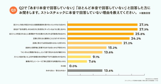 Q2で「あまり本音で回答していない」「ほとんど本音で回答していない」と回答した方に対して、「Q3. ストレスチェックに本音で回答していない理由を教えてください。(複数回答)」(n=66)と質問したところ、「高ストレス者と判定されると産業医面談を受けないといけなくなるから」が27.3%、「会社が「法令遵守」のためだけに形式的にやっているように感じるから」が27.3%、「高ストレス判定されると人事異動や今の仕事から外される可能性があるから」が25.8%という回答となりました。ここから、従業員側が抱く「調査への不信感」や「不利益を被ることへの不安」が、回答を躊躇させる主な要因となっていることが推察されます。