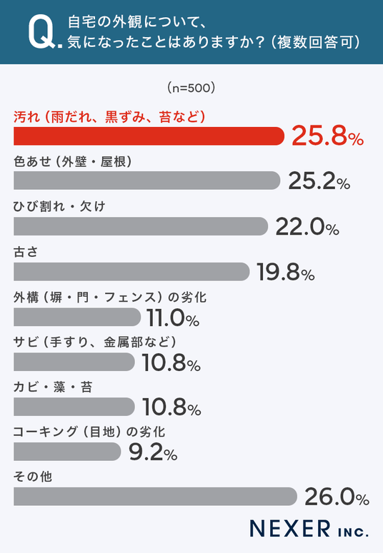 最も多かったのは「汚れ(雨だれ、黒ずみ、苔など)」で25.8%でした。次いで「色あせ(外壁・屋根)」が25.2%、「ひび割れ・欠け」が22.0%、「古さ」が19.8%という結果です。