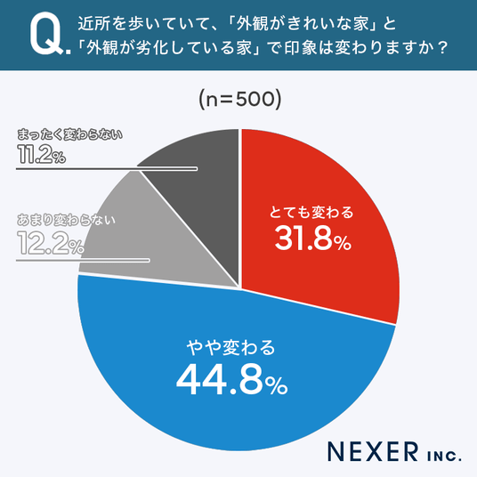 続いて、「外観がきれいな家」と「外観が劣化している家」では近所を歩いていて印象が変わるかを聞いてみました。