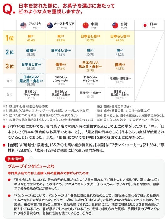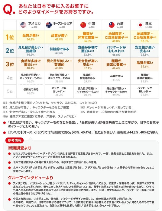 味の評価は文化によって大きく異なることが試食調査からも明らかとなり、同じエリア内はもちろん、 日本においても、同一のお菓子に対して多様な評価がなされている様子がうかがえました。