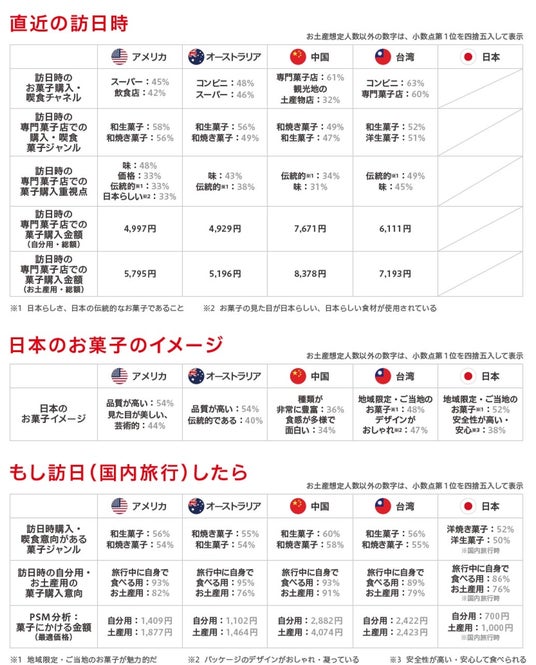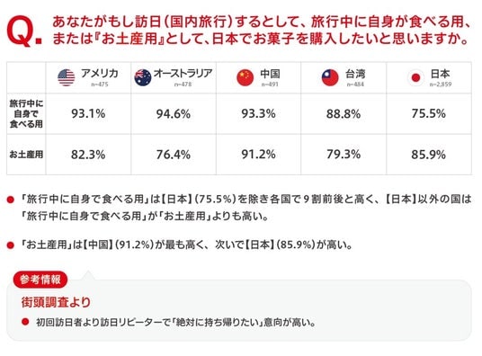 今回のWEB調査によると、訪日時のお菓子購入意向は、日本を除く今回の調査対象4カ国で「自身で旅行中に食べる用」としてが9割前後と高い水準となりました。