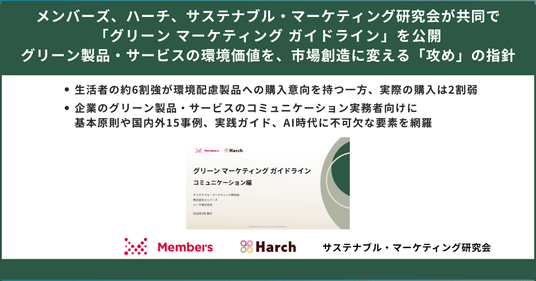 “Publishing a Better Future”(よりよい未来を、みんなに届ける)をコンセプトにWebメディア運営・サステナビリティ支援事業を手がけるハーチ株式会社(東京都中央区、代表取締役:加藤佑、以下 ハーチ)は、DX現場支援で顧客と共に社会変革をリードする株式会社メンバーズ(本社:東京都中央区、代表取締役社長:高野 明彦、東証プライム:2130、以下「メンバーズ」)とサステナブル・マーケティング研究会(リーダー:駒澤大学 経営学部 教授 青木 茂樹)と共同で、グリーン製品・サービスを適切かつ魅力的に社会に発信する指針や手法をまとめた、企業のコミュニケーション実務者向け「グリーン マーケティング ガイドライン」を公開したことをお知らせします(※1)。