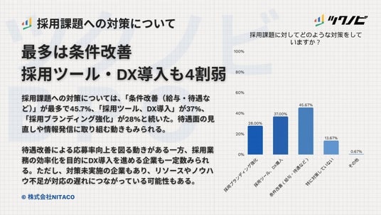 採用課題への対策としては、「条件改善(給与・待遇など)」が45.7%で最も多く、「採用ツール、DX導入」が37%、「採用ブランディング強化」が28%と続きました。待遇面の見直しに加え、採用活動の効率化や発信強化に取り組む動きもみられます。
