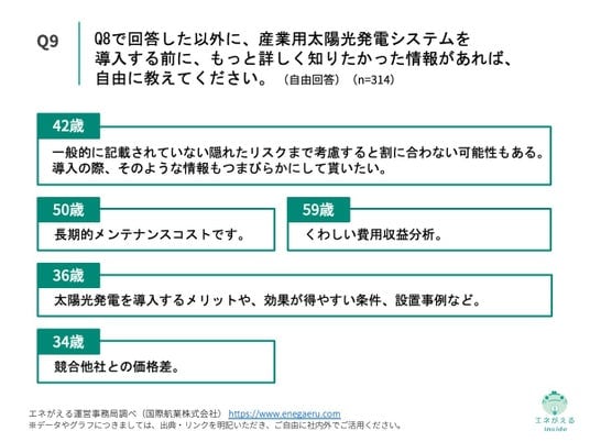 Q9. Q8で「特に知りたい情報はなかった」「わからない/答えられない」以外を回答した方にお聞きします。Q8で回答した以外に、産業用太陽光発電システムを導入する前に、もっと詳しく知りたかった情報があれば、自由に教えてください。