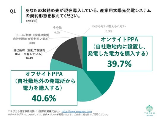 「Q1. あなたのお勤め先が現在導入している、産業用太陽光発電システムの契約形態を教えてください。」(n=330)と質問したところ、「オンサイトPPA(自社敷地内に設置し、発電した電力を購入する)」が39.7%、「オフサイトPPA(自社敷地外の発電所から電力を購入する)」が40.6%という回答になりました。