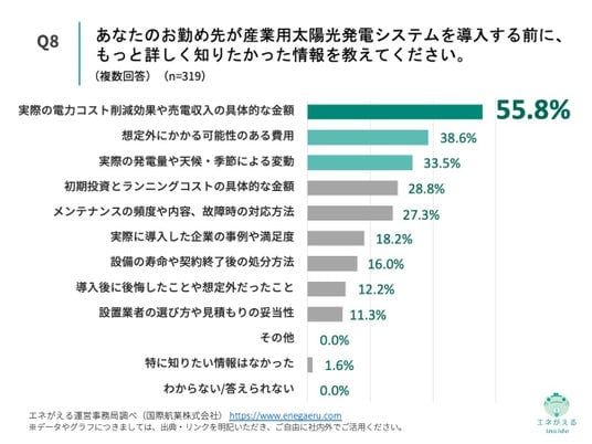 「Q8. Q1で「オンサイトPPA(自社敷地内に設置し、発電した電力を購入する)」「オフサイトPPA(自社敷地外の発電所から電力を購入する)」「自己所有(自社で設備を購入・所有している)」と回答した方にお聞きします。あなたのお勤め先が産業用太陽光発電システムを導入する前に、もっと詳しく知りたかった情報を教えてください。(複数回答)」(n=319)と質問したところ、「実際の電力コスト削減効果や売電収入の具体的な金額」が55.8%、「想定外にかかる可能性のある費用」が38.6%という回答になりました。
