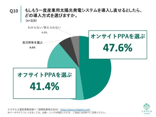 「Q10. Q1で「オンサイトPPA(自社敷地内に設置し、発電した電力を購入する)」「オフサイトPPA(自社敷地外の発電所から電力を購入する)」「自己所有(自社で設備を購入・所有している)」と回答した方にお聞きします。もしもう一度産業用太陽光発電システムを導入し直せるとしたら、どの導入方式を選びますか。」(n=319)と質問したところ、「オンサイトPPAを選ぶ」が47.6%、「オフサイトPPAを選ぶ」が41.4%という回答になりました。