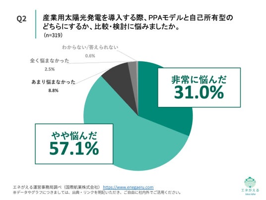 「Q2. Q1で「オンサイトPPA(自社敷地内に設置し、発電した電力を購入する)」「オフサイトPPA(自社敷地外の発電所から電力を購入する)」「自己所有(自社で設備を購入・所有している)」と回答した方にお聞きします。産業用太陽光発電を導入する際、PPAモデルと自己所有型のどちらにするか、比較・検討に悩みましたか。」(n=319)と質問したところ、「非常に悩んだ」が31.0%、「やや悩んだ」が57.1%という回答になりました。