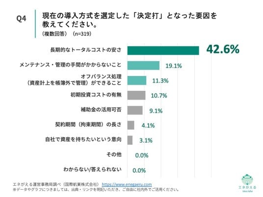 「Q4. Q1で「オンサイトPPA(自社敷地内に設置し、発電した電力を購入する)」「オフサイトPPA(自社敷地外の発電所から電力を購入する)」「自己所有(自社で設備を購入・所有している)」と回答した方にお聞きします。現在の導入方式を選定した「決定打」となった要因を教えてください。」(n=319)と質問したところ、「長期的なトータルコストの安さ」が42.6%、「初期投資コストの有無」が10.7%という回答になりました。