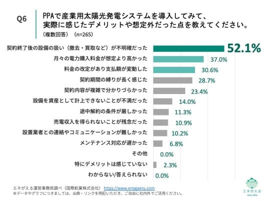 「Q6. Q1で「オンサイトPPA(自社敷地内に設置し、発電した電力を購入する)」「オフサイトPPA(自社敷地外の発電所から電力を購入する)」と回答した方にお聞きします。PPAで産業用太陽光発電システムを導入してみて、実際に感じたデメリットや想定外だった点を教えてください。(複数回答)」(n=265)と質問したところ、「契約終了後の設備の扱い(撤去・買取など)が不明確だった」が52.1%、「月々の電力購入料金が想定より高かった」が37.0%という回答になりました。