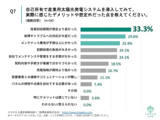 「Q7. Q1で「自己所有(自社で設備を購入・所有している)」と回答した方にお聞きします。自己所有で産業用太陽光発電システムを導入してみて、実際に感じたデメリットや想定外だった点を教えてください。(複数回答)」(n=54)と質問したところ、「投資回収期間が想定より長かった」が33.3%、「故障やトラブルへの対応が大変だった」が29.6%という回答になりました。