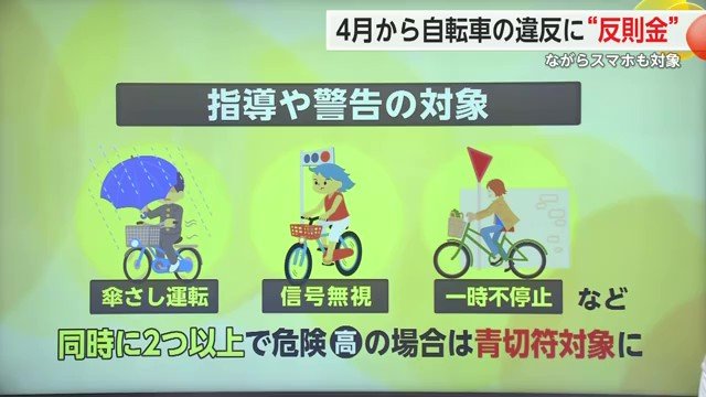 これら以外にも、傘をさしながらの運転や信号無視、一時停止無視などは指導や警告の対象だが、2つ以上を同時に行うなど事故の危険が高まっているときには同じく青切符の対象になる。