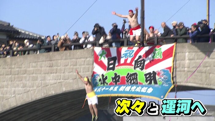 宮下会長が先陣を切り、男たちも次々と運河へ。今回の最高齢である50歳の同級生コンビもダイブする。