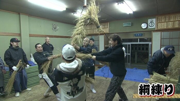「綱練り」は、わらでできた3本の「小綱(こづな)」を練り合わせ、1本の頑丈な「大綱(おおつな)」を作り上げる作業だ。締め付けが緩いとすぐに切れてしまうため、息の合った連携プレーが求められる。