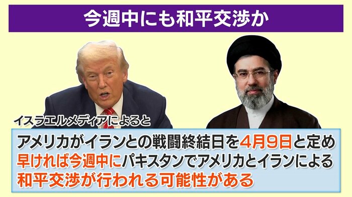 イスラエルメディアは、アメリカはイランとの戦闘終結日を4月9日に設定し、早ければ今週中にパキスタンで、アメリカとイランによる和平交渉が行われる可能性があると報道しています。