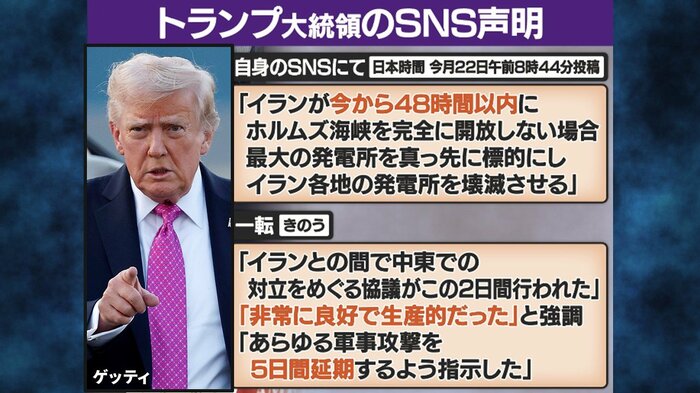 日本時間23日午後8時過ぎ、トランプ大統領は自身のSNSで、48時間としていた軍事攻撃の期限を、急きょ「5日間延期する」と発表しました。