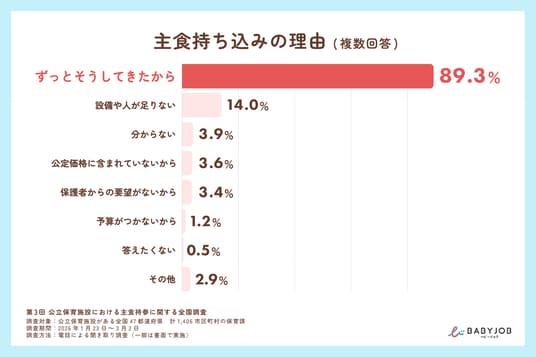保育施設向け紙おむつのサブスク「手ぶら登園」など、子育て支援サービスを展開するBABY JOB株式会社(本社:大阪府大阪市、代表取締役 上野公嗣)は、全国の公立保育施設がある1,406の市区町村の保育課を対象に、「3歳児以降の主食持参に関する実態調査(2026年版)」を実施いたしました。