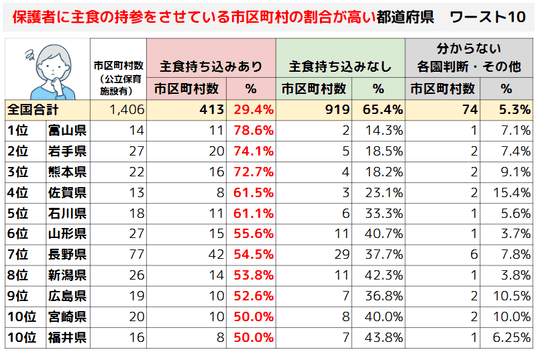 主食の持参を求めている市町村の割合は全国平均で29.4%でした。都道府県別に見ると、高かったのは富山県・岩手県で、いずれも7割を超えました。一方、滋賀県をはじめとする5府県では、主食持参を求めている市町村は確認されませんでした。