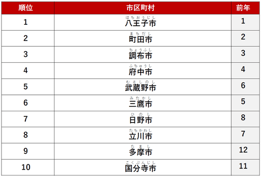 2位に「町田市」、3位に「調布市」がランクインしました。