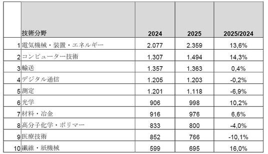 EPO全体における2025年の欧州特許出願上位3技術分野は、コンピューター技術(+6.1%、AIが牽引)、デジタル通信(+11.4%、6Gモバイルネットワーク技術開発のグローバル競争が後押し)、電気機械・装置・エネルギー(+5.3%、電池イノベーションの急増が支持)でした。