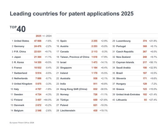 欧州特許庁(EPO)は昨年、過去最多となる201,974件の特許出願を受理しました。これは本日発表された『EPOテクノロジー・ダッシュボード2025』(旧称:『特許インデックス』)によるものです。出願件数が20万件を超えたのは今回が初めてです。日本企業・発明者の出願件数は21,304件で、EPOにおける出願国の第4位となりました。全体として、特許出願件数は平均1.4%増加し、欧州(EU27)からの出願は+0.7%増、欧州外からの出願は+2.1%増となりました。特許出願は企業の研究開発投資の先行指標となっています。