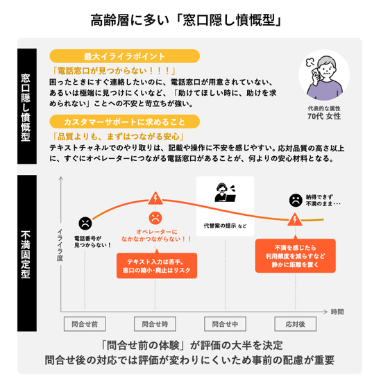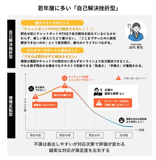カスタマーサポート利用時の不満は一様ではなく、問合せ前の体験を起点とした不満の生まれ方には、属性や行動特性による傾向差がありました。その中でも、若年層に多い「自己解決を試みたものの解決できずに不満が高まる『自己解決挫折型』」と、高齢層に多い「問合せ先が見つからないこと自体に強い不満を感じる『窓口隠し憤慨型』といった対照的なケースが確認され、不満の生じ方や、その後の評価回復のしやすさに違いが見られました。こうした結果から、企業には応対品質の改善にとどまらず、顧客の属性や行動特性の違いを踏まえ、問合せ前の導線や自己解決環境を含めた体験全体を設計する視点が求められていると言えるでしょう。