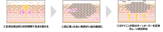 一般的に、ターンオーバー(肌の生まれ変わり)は約28日と言われますが、これはあくまでも健康な20代の方の目安です。年齢とともにこの周期は長くなり、30代以降は肌トラブルが改善するまでの目安も年齢に比例して長くなります。そのため、気温上昇で薄着になる時期に向けて、早めの対策を心がけましょう。<ターンオーバーを整え、角質いぼに効果のある“ヨクイニン”という選択肢>