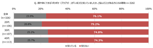 続いて、前項で「悩んだことがある」と回答した人にお肌にできる“ポツポツ” の正体が「いぼ」であると知っていたかと尋ねたところ、「知らない」と答えた方は76.1%に達しました。約8割の方が、自身の肌トラブルが「いぼ」であると認識しておらず、そのために適切な対処法に結びついていない可能性が考えられます。