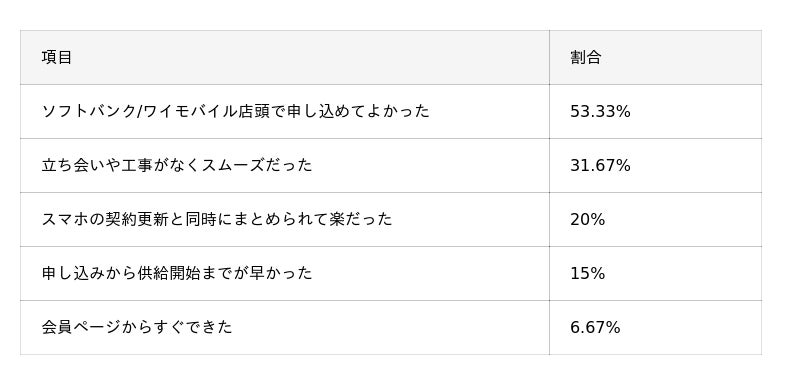 - 乗り換え時の手続きについて、53.33%が「店頭で申し込めてよかった」、31.67%が「工事がなくスムーズだった」と回答。スマホの契約更新に合わせて手軽に切り替えられる点が大きなメリットとして捉えられている。